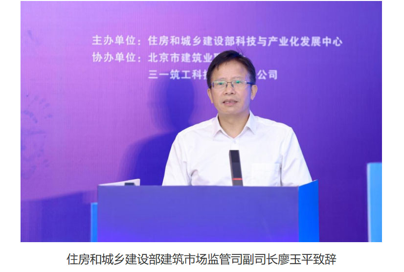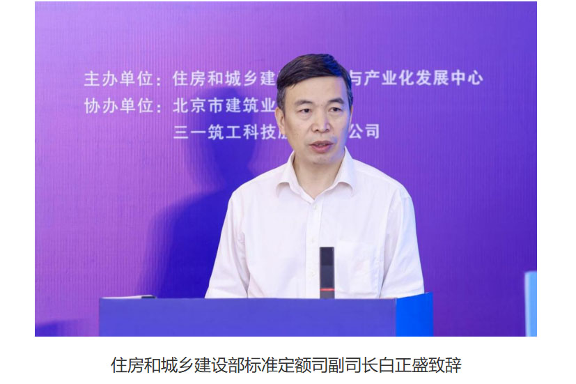 住房和城乡建设部标准定额司副司长白正盛、建筑市场监管司副司长廖玉平,住房和城乡建设部科技与产业化发展中心副主任武振,三一集团总裁助理马云飞出席会议并致辞。浙江省嘉兴市住房和城乡建设局副局长朱斌,北京市住房和城乡建设委员会科技与信息化处副处长张晋波、北京市建筑业联合会副秘书长张奎波等领导和专家参加会议。会议由住房和城乡建设部科技与产业化发展中心产业发展处处长刘美霞、村镇建设与人居环境处副处长赵华主持。